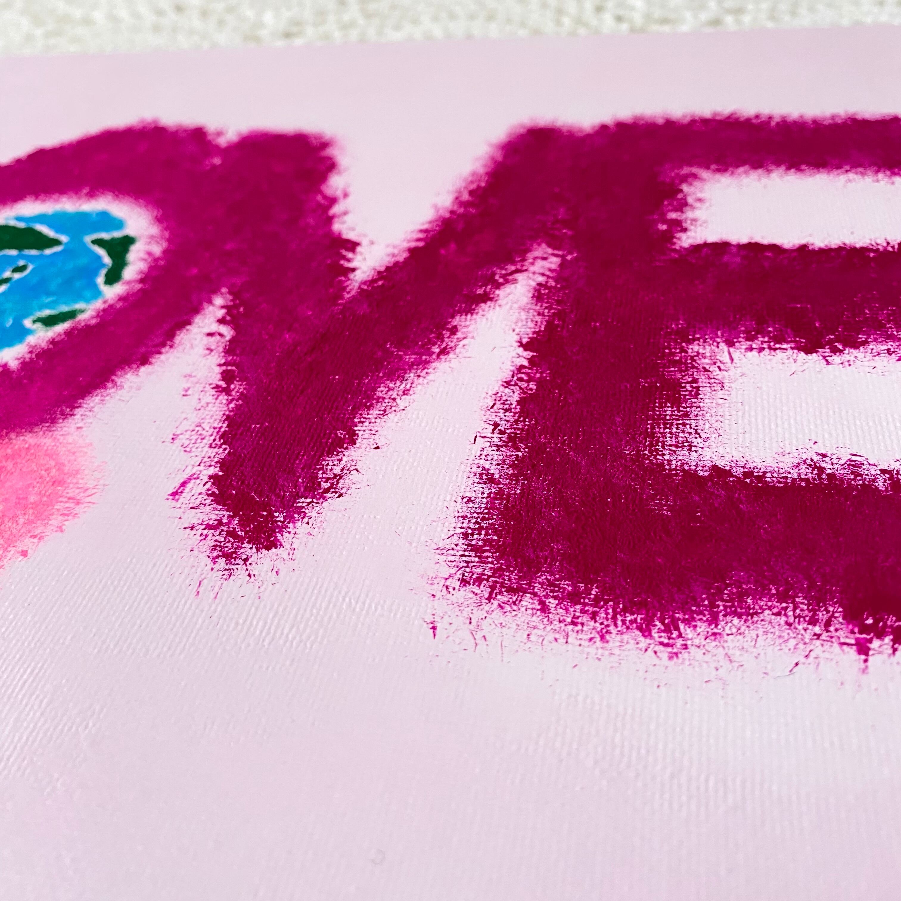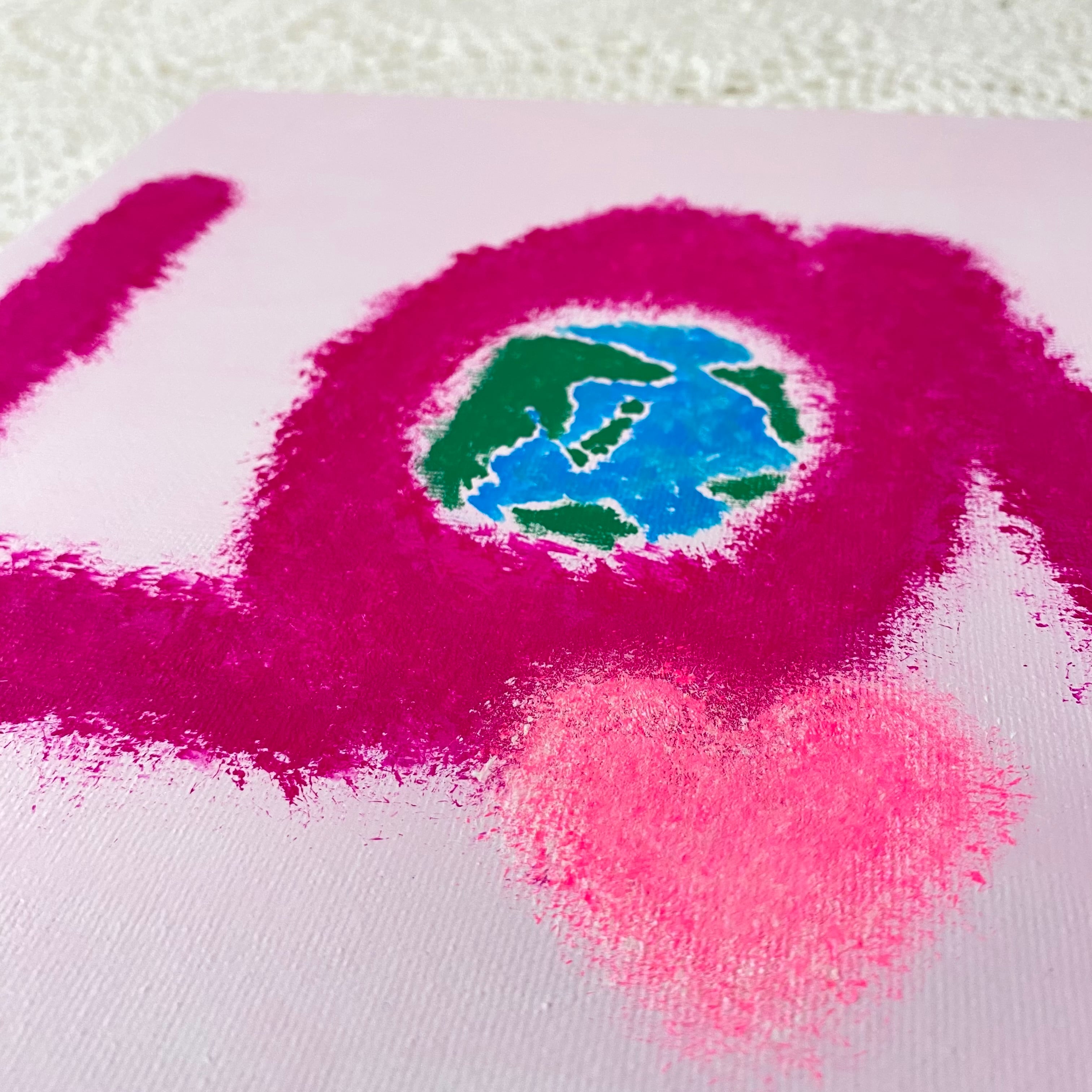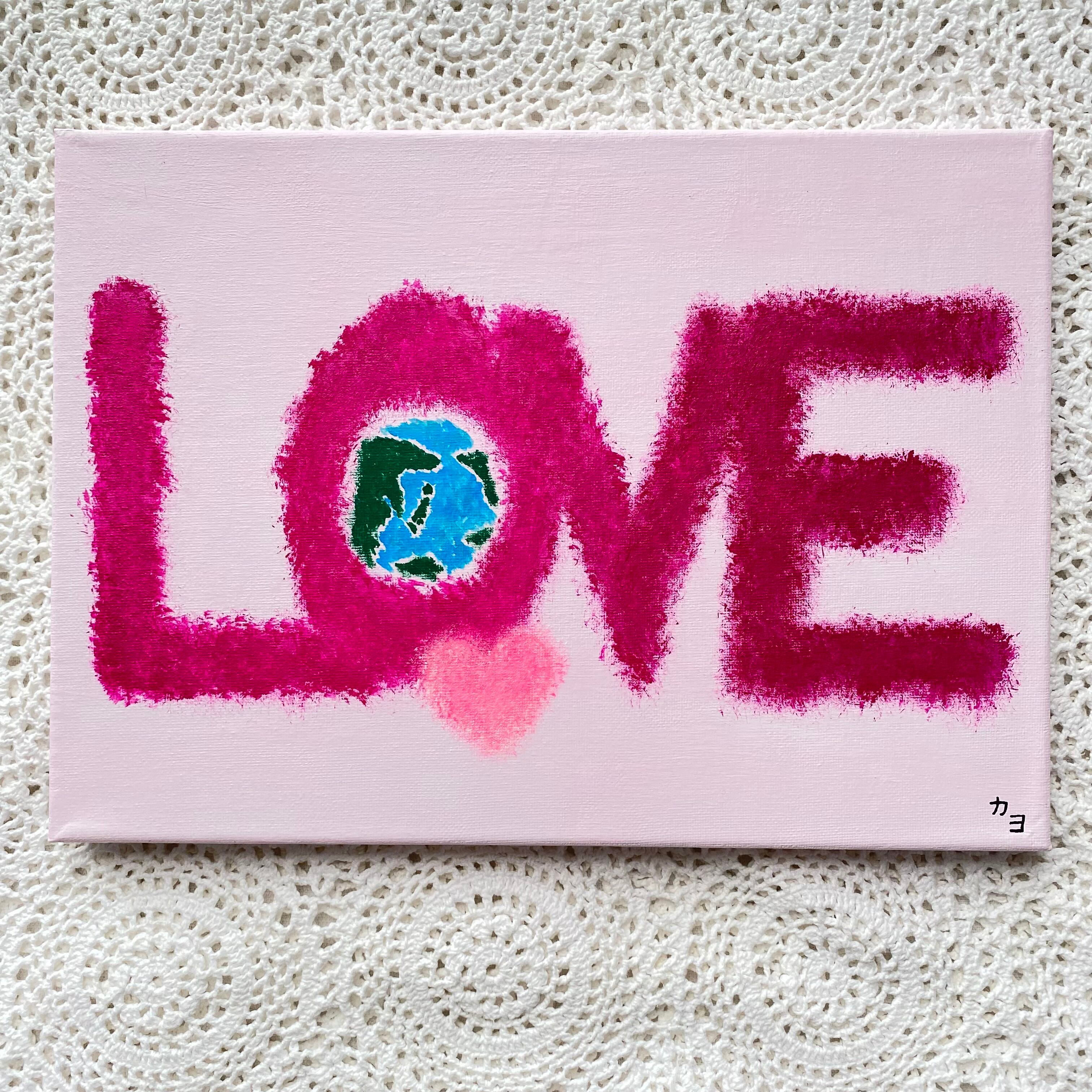 柔らかいピンク色のキャンバスに幾つかのピンクを重ねたLOVEの文字。Oの中には地球。