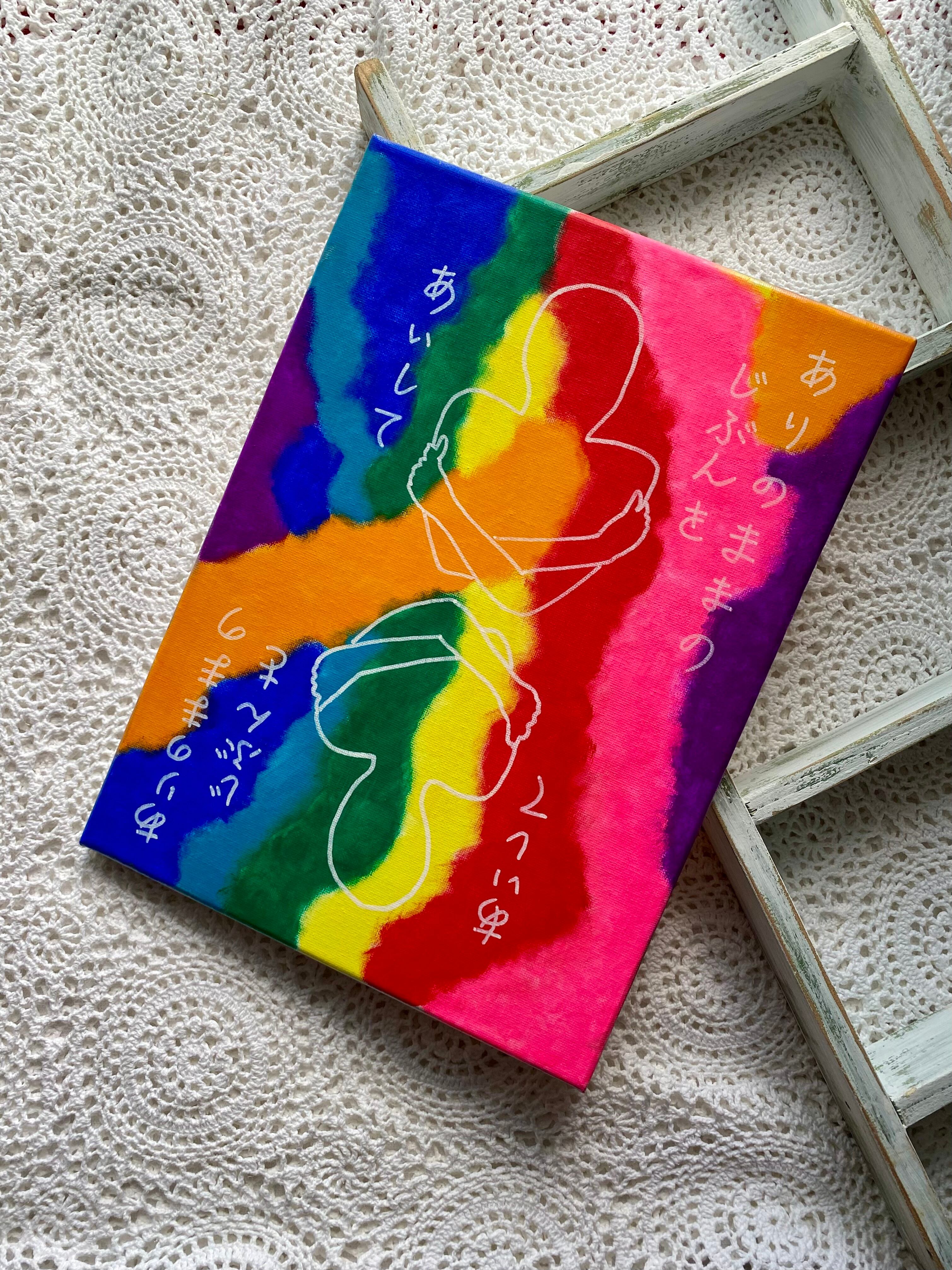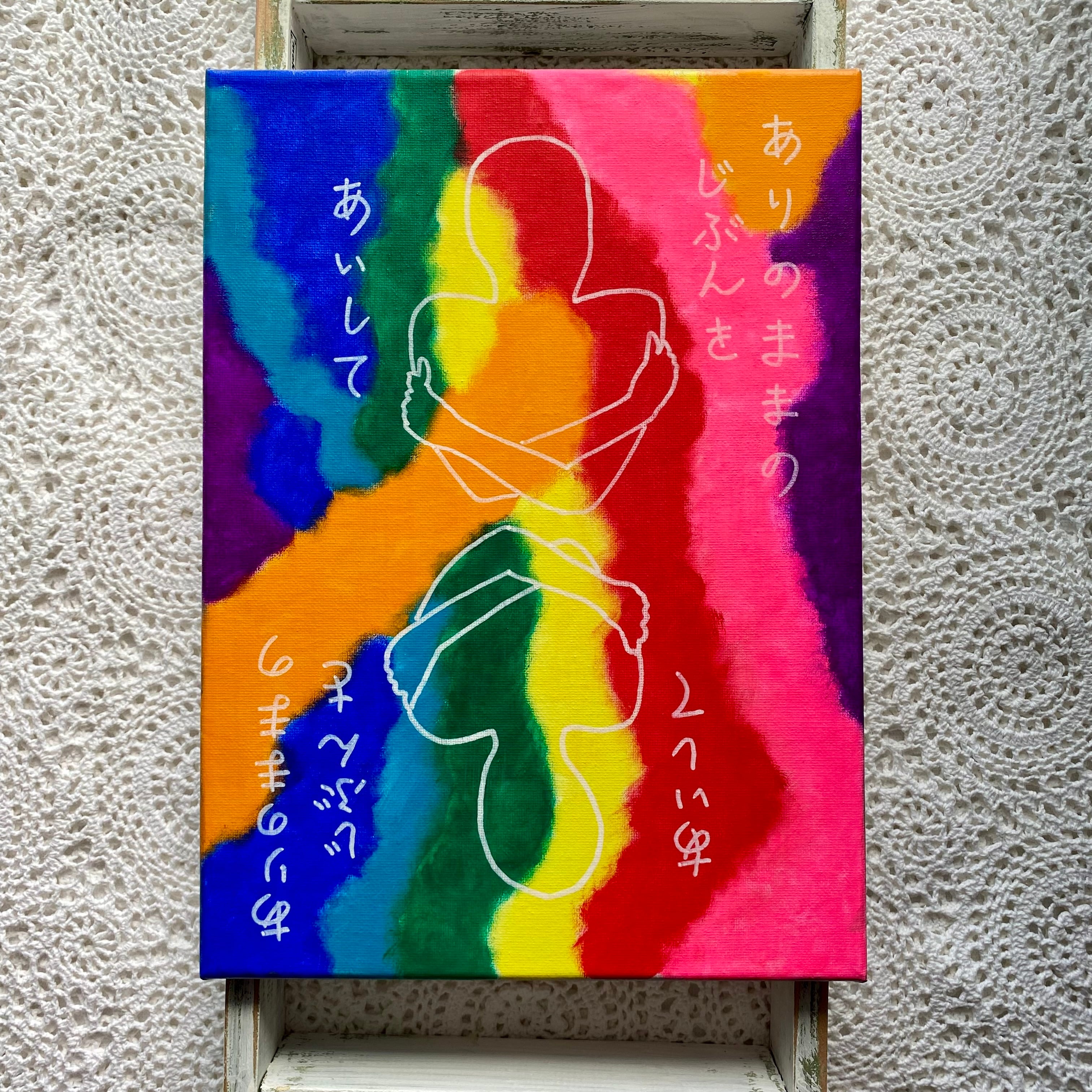 プライドフラッグカラーのカラフルな背景に自分を抱きしめている人が2人。女性っぽいシルエットと男性っぽいシルエット。あくまでも“ぽい”がポイントです。