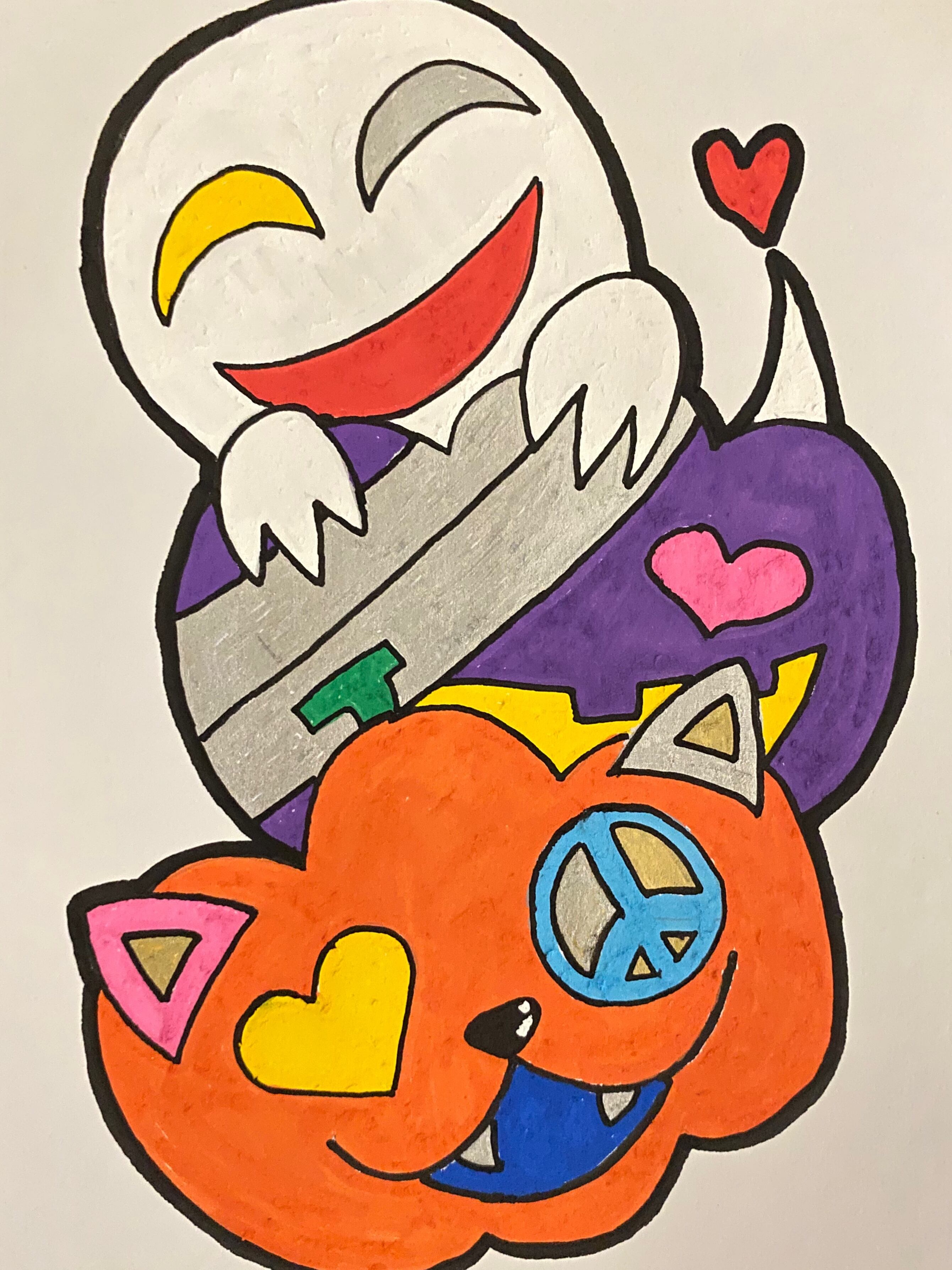 LOVE&PEACEフェイスのジャック・オー・ランタンとオバケが積み木の用に重なって仲良くハロウィンをお祝いしています。ハロウィン時期のお部屋のディスプレイにいかがでしょうか?