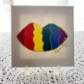 テーマの象徴である、PRIDELIPSをプライドフラッグからーでミニサイズのキャンバスに描き、保護塗り後にストーンを並べてキラリとさせたミニアートです。